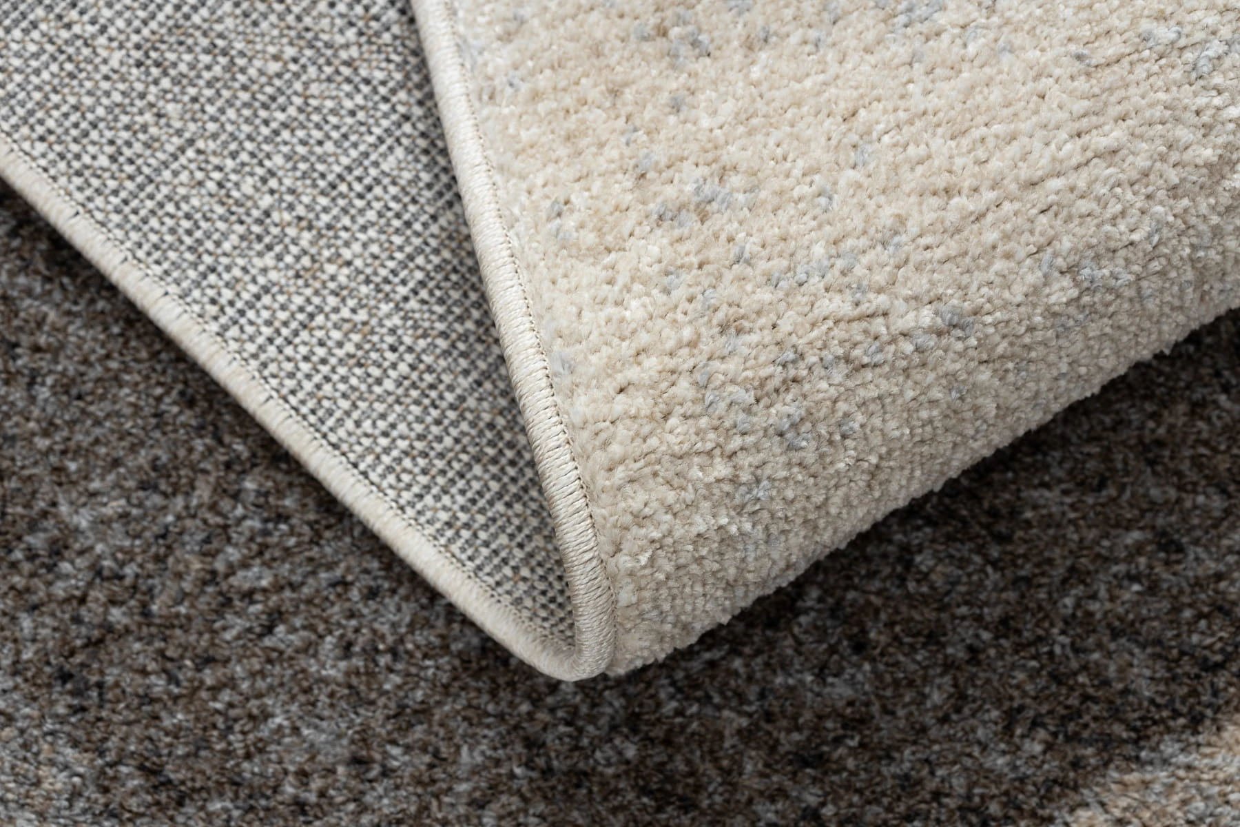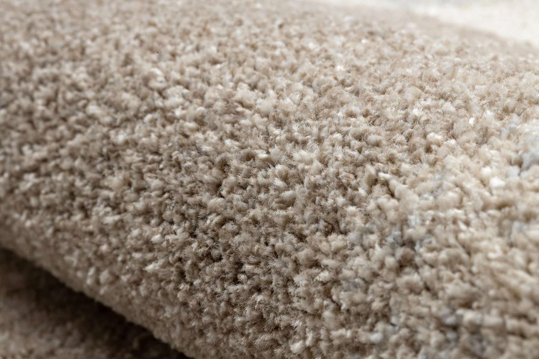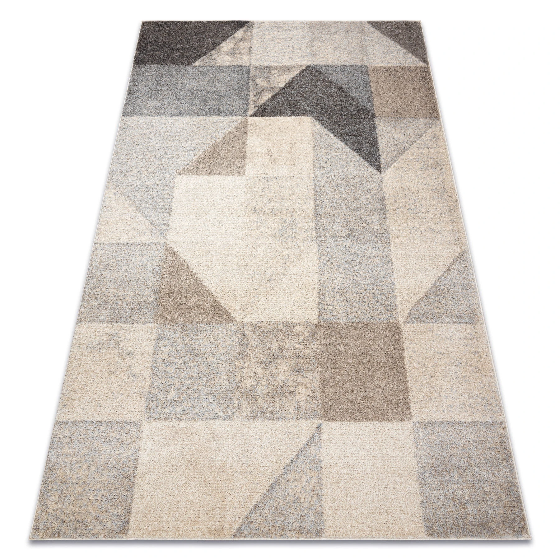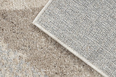 Kremowo-beżowy dywan z geometrycznym wzorem, który wprowadzi do salonu nowoczesny charakter i ciepłą atmosferę.
