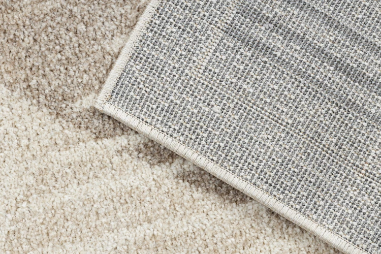 Beżowy dywan z geometrycznym wzorem, który wprowadzi do salonu nowoczesny charakter i ciepłą atmosferę.