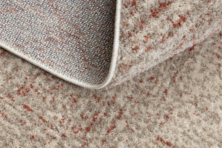 Kremowy dywan z terakotowymi akcentami i geometrycznym wzorem, który doda salonowi nowoczesnego charakteru.