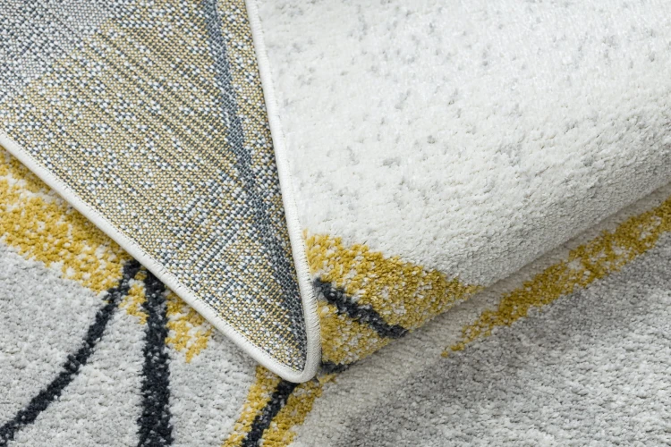 Szary dywan z abstrakcyjnym wzorem, który doskonale sprawdzi się w korytarzu, nadając mu nowoczesny charakter.