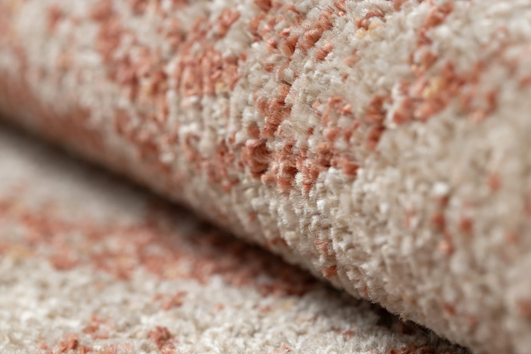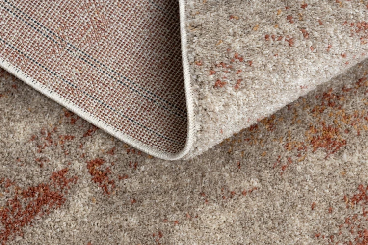 Beżowy dywan z terakotowym wzorem abstrakcyjnym, który wprowadzi ciepłe akcenty kolorystyczne do salonu lub pokoju.