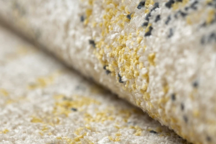 Żółty dywan z abstrakcyjnym wzorem, który ożywi wnętrze ciepłym, słonecznym akcentem.