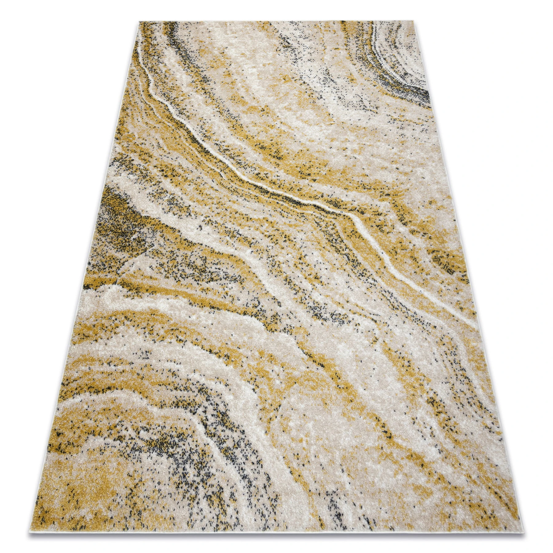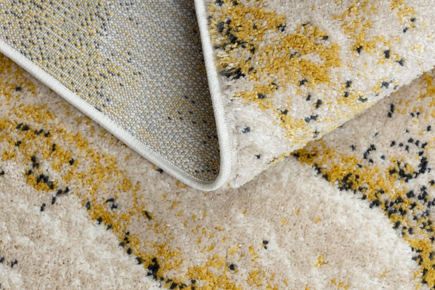 Żółty dywan z abstrakcyjnym wzorem, który rozjaśni korytarz ciepłym, energetycznym akcentem.
