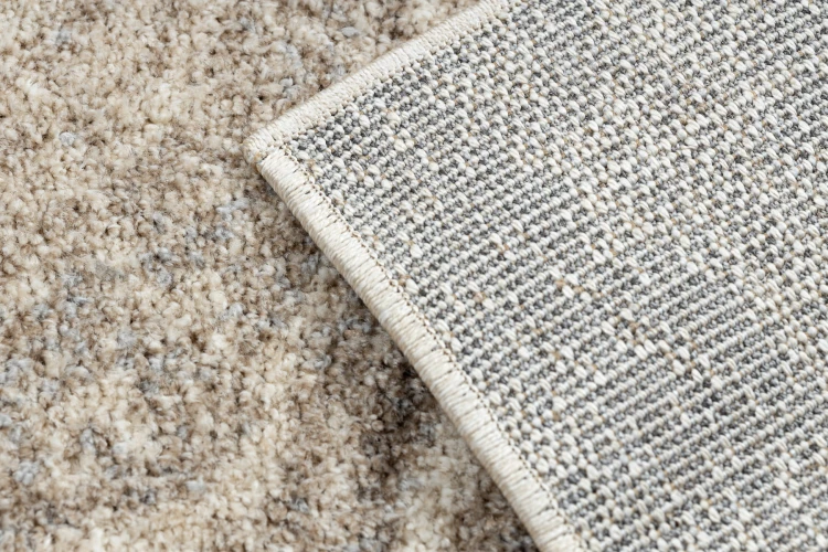 Beżowy dywan z abstrakcyjnym wzorem, który doskonale wpisze się w nowoczesny salon lub pokój.
