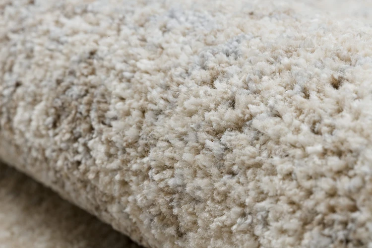 Beżowy dywan z abstrakcyjnym wzorem, który doskonale wpisze się w nowoczesny salon, dodając wnętrzu artystycznego charakteru.