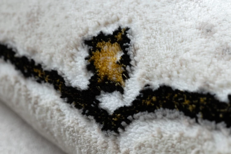 Beżowy dywan z abstrakcyjnym wzorem marmurkowym, który wprowadzi do salonu stonowaną elegancję i naturalny charakter.