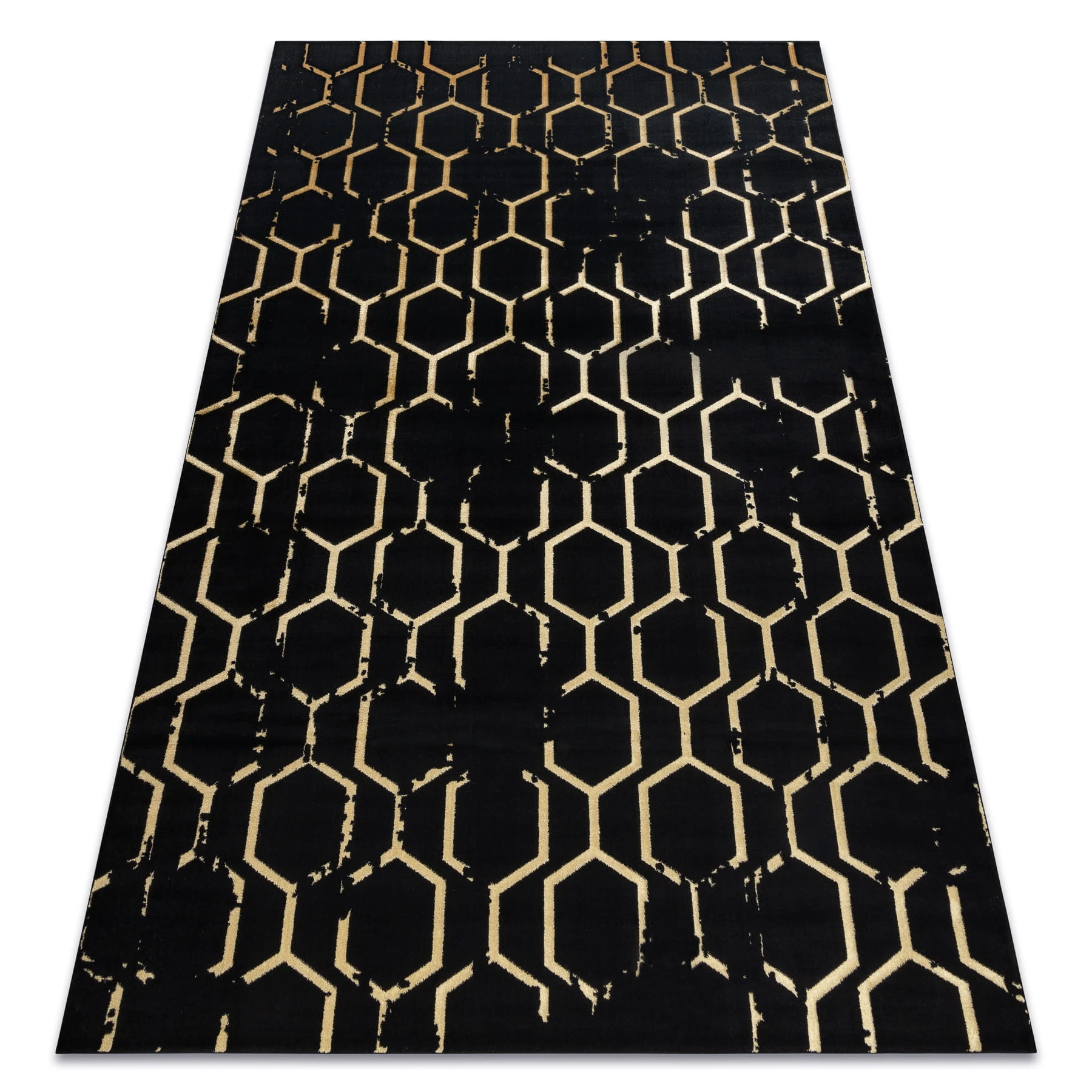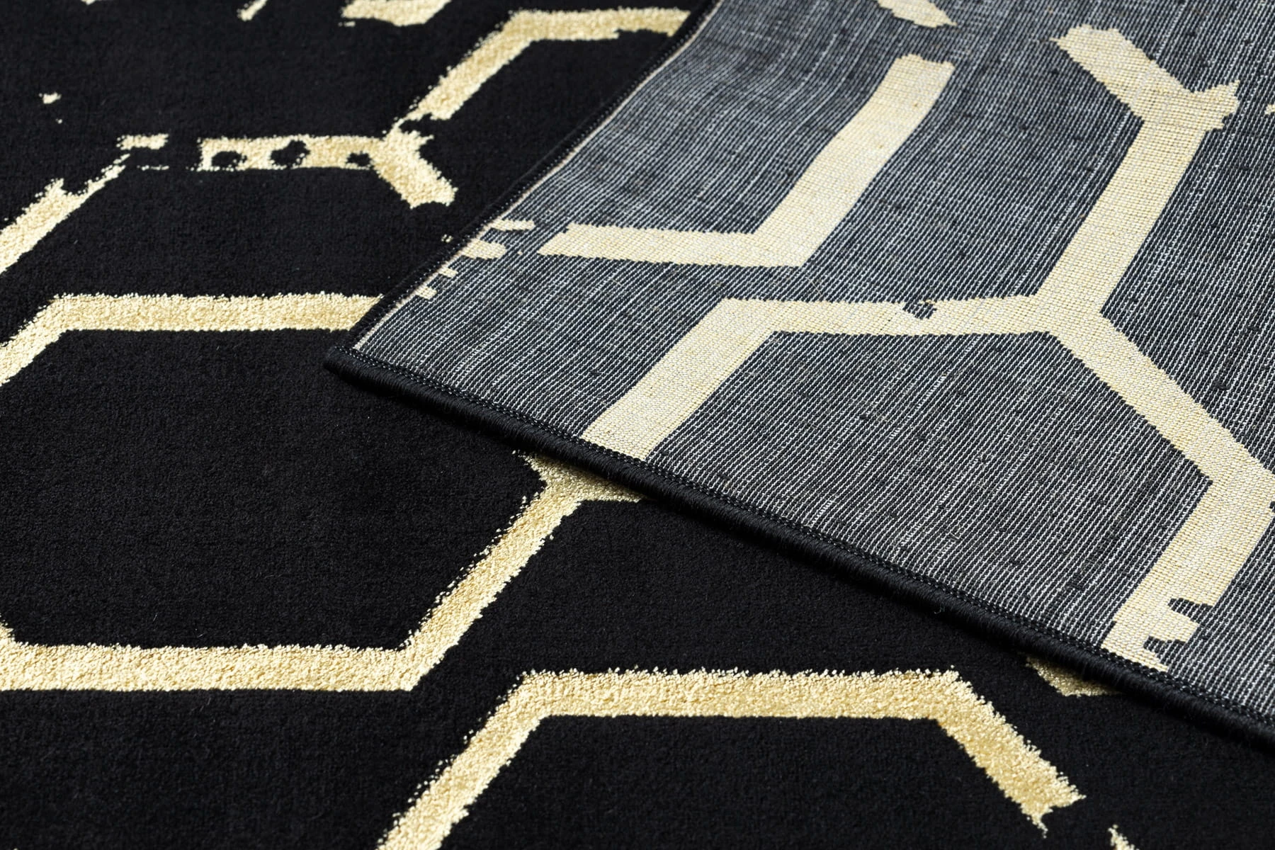 Czarny dywan z geometrycznym wzorem w złocistych akcentach, który doda wnętrzu elegancji i nowoczesnego charakteru.