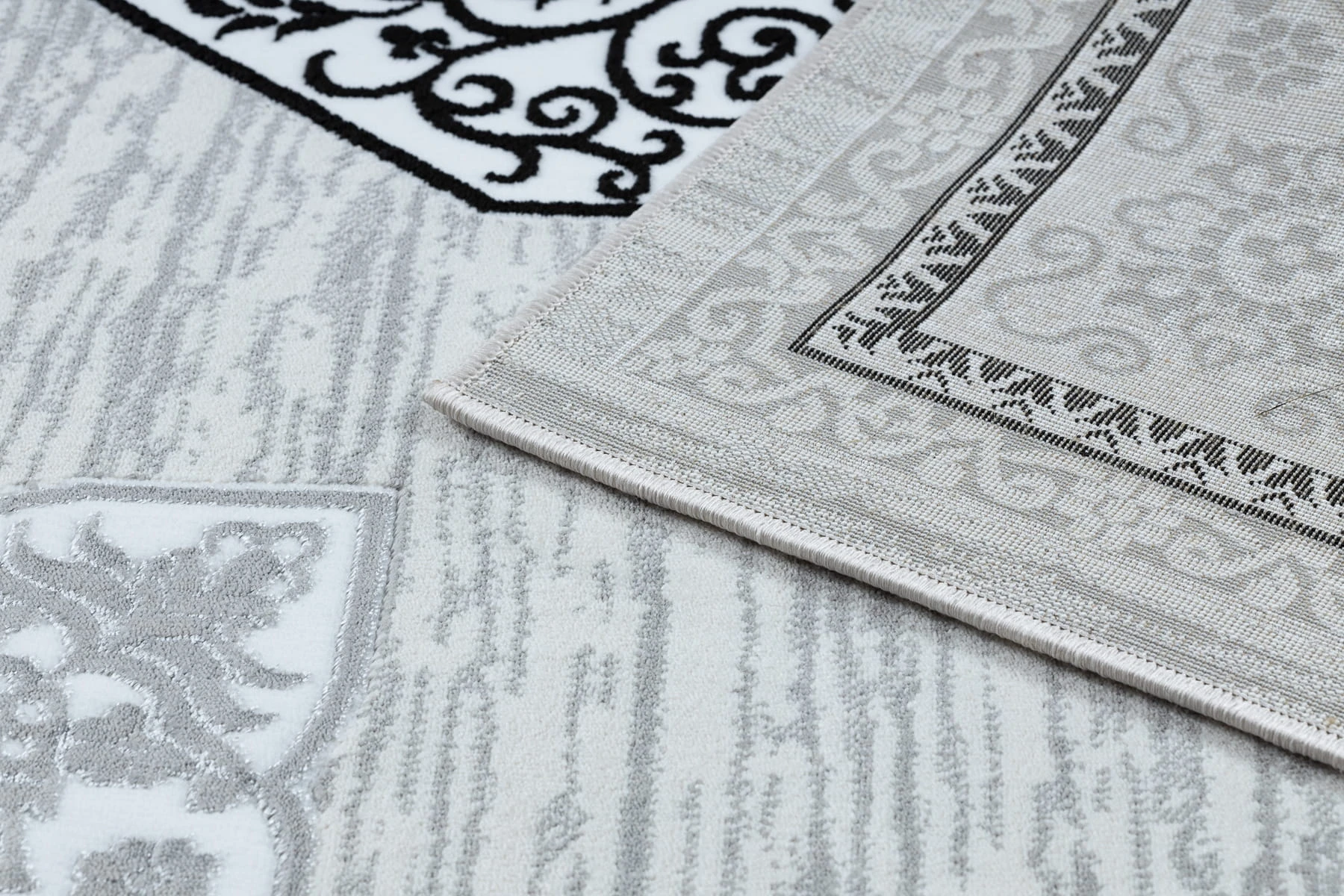 Szaro-kremowy dywan z ozdobnym wzorem ornamentowym i delikatną ramką, który doda salonowi klasycznego charakteru.