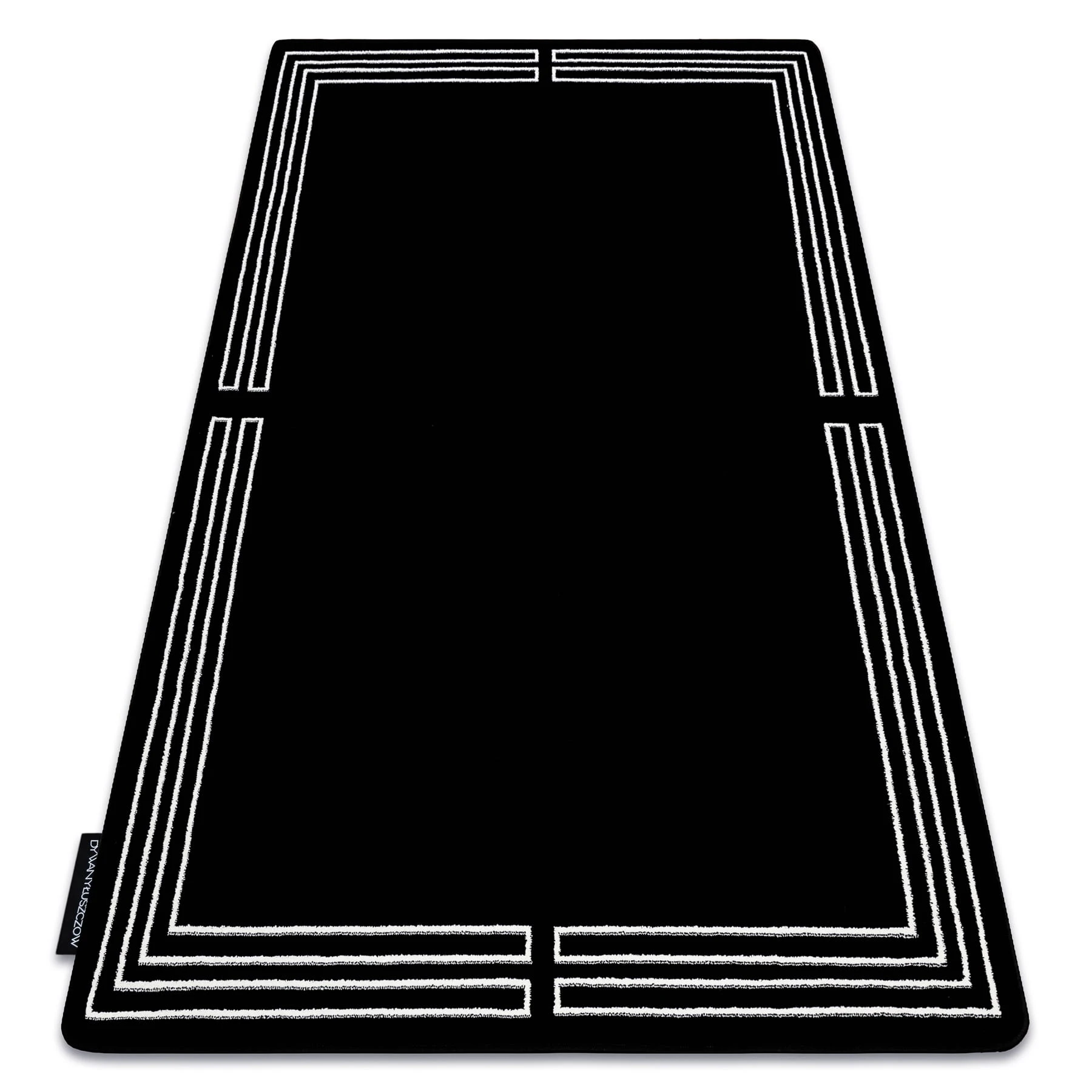 Czarny dywan z motywem ramki, który doda salonowi elegancki akcent i wyznacz strefy w pomieszczeniu.