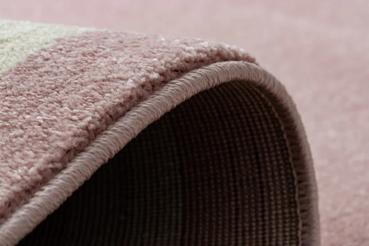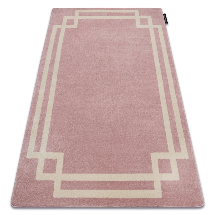Różowy dywan z subtelną ramką, który doda salonowi ciepła i kobiecego charakteru.