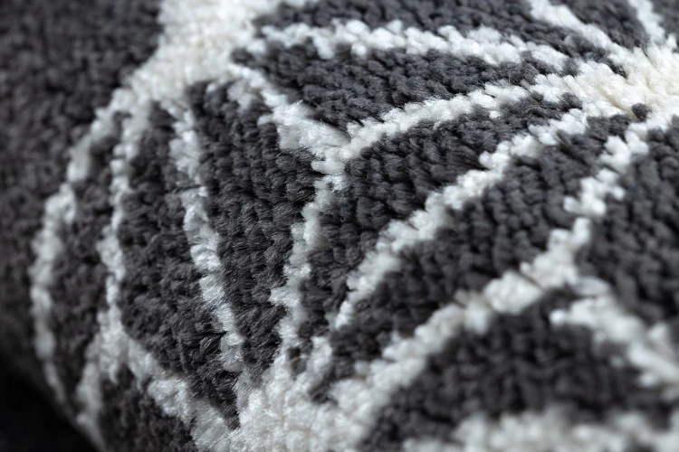 Antracytowy dywan z abstrakcyjnym wzorem heksagonów w kremowych odcieniach, który doda salonowi nowoczesny charakter.
