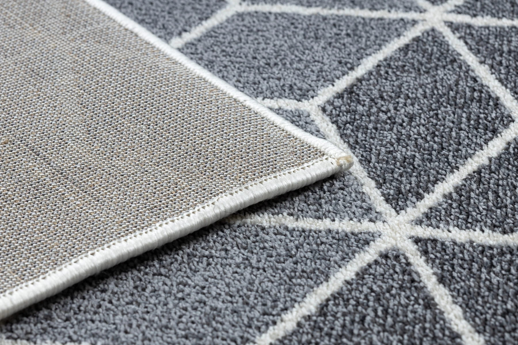 Kremowo-srebrny dywan z geometrycznym wzorem kostek, który doskonale wpisze się w nowoczesne wnętrza salonu lub pokoju.