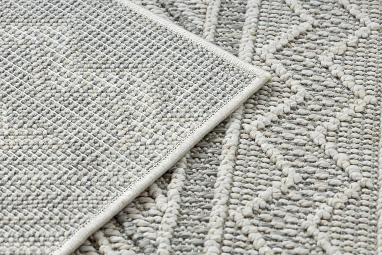 Szary dywan z geometrycznym wzorem rombów, który doskonale sprawdzi się w salonie lub pokoju, dodając wnętrzu nowoczesny charakter.