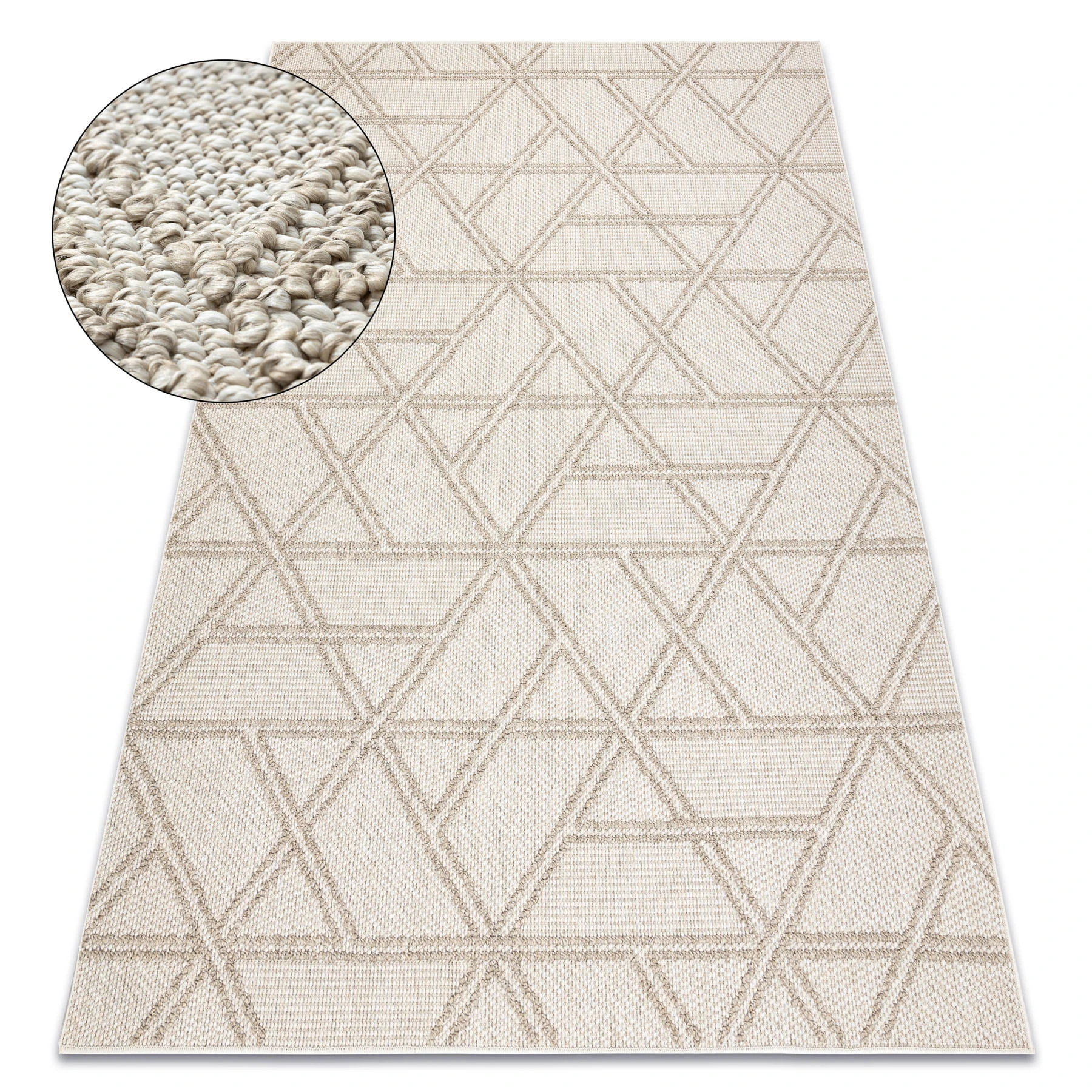 Beżowy dywan z geometrycznym wzorem rombów, który doskonale sprawdzi się w korytarzach, dodając im nowoczesny charakter.