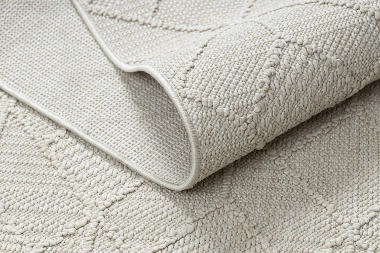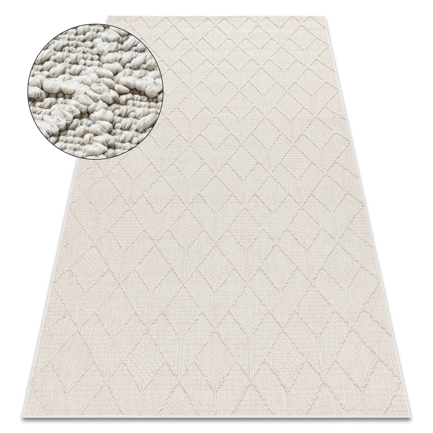 Kremowy dywan z geometrycznym wzorem, który doskonale wpasuje się w nowoczesny salon lub pokój.