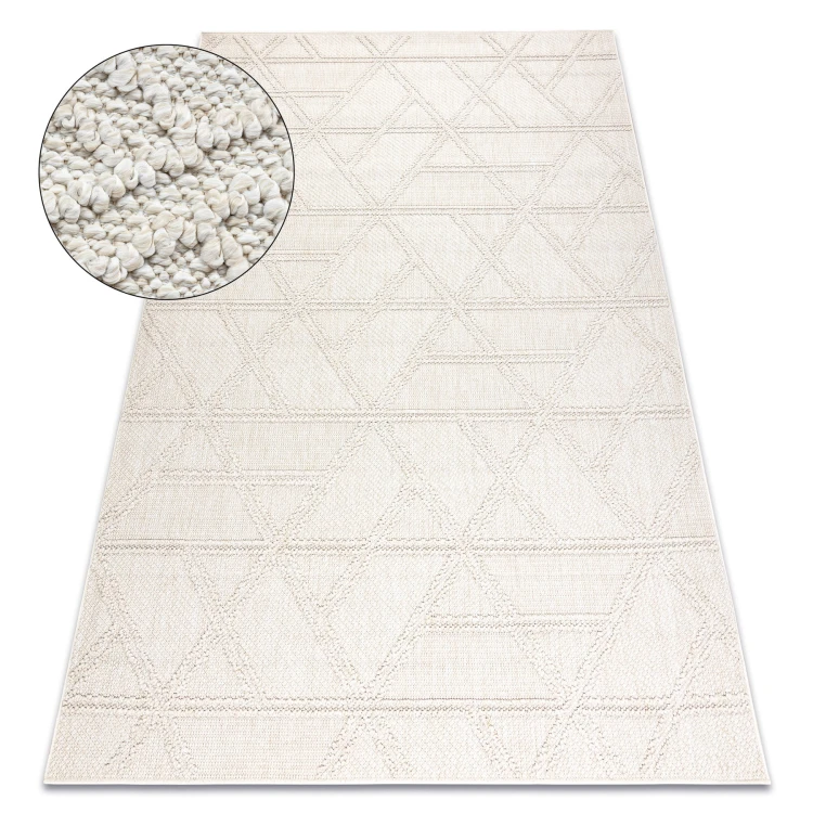 Kremowy dywan z geometrycznym wzorem rombów, który doskonale sprawdzi się w salonie lub pokoju, nadając wnętrzu nowoczesny charakter.