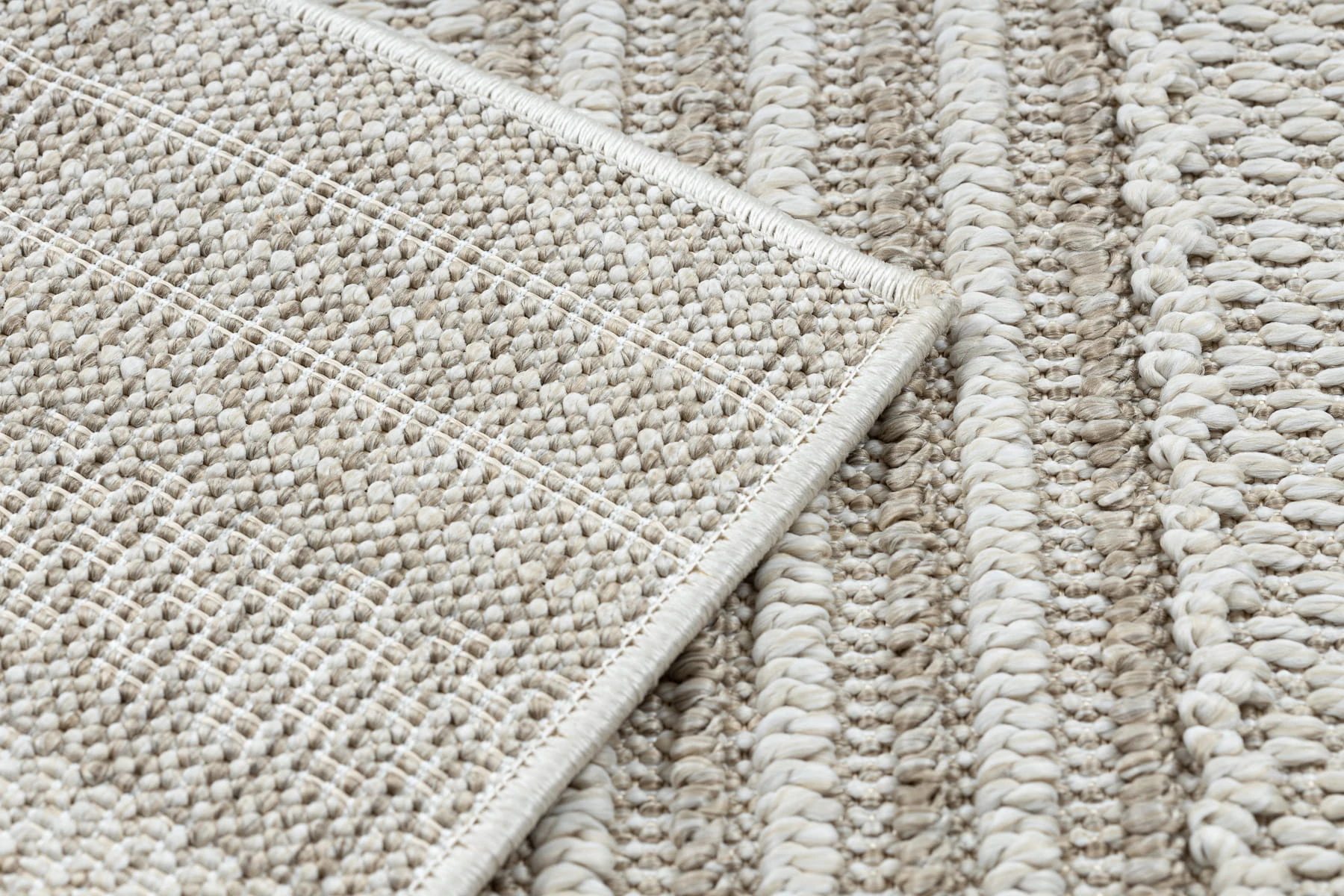 Beżowy dywan z abstrakcyjnym wzorem linii, który doskonale wpisze się w nowoczesny salon lub pokój.