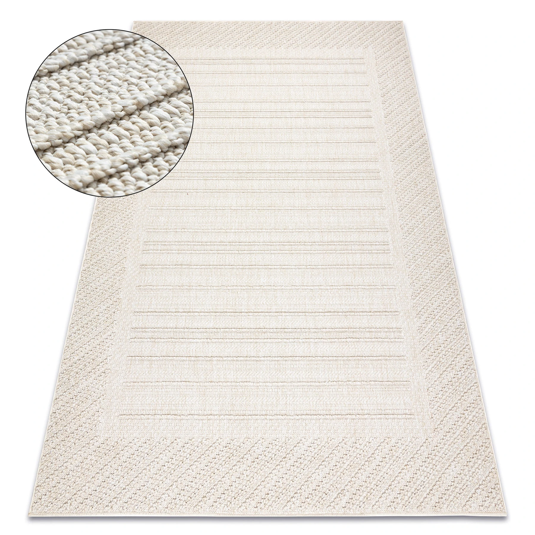Kremowy dywan z elegancką ramką, który doskonale sprawdzi się w korytarzu, nadając mu uporządkowany i harmonijny wygląd.