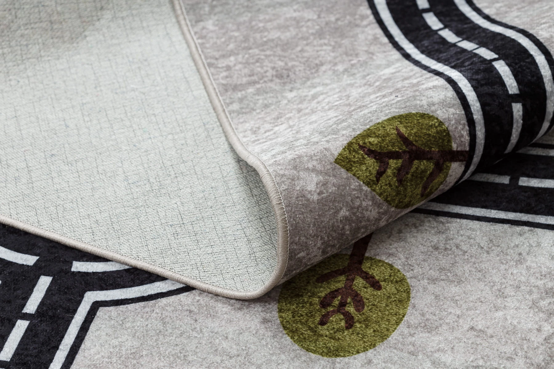 Beżowy dywan z motywem miasta, który stworzy przestrzeń do zabawy i zachęci do tworzenia własnych historii.
