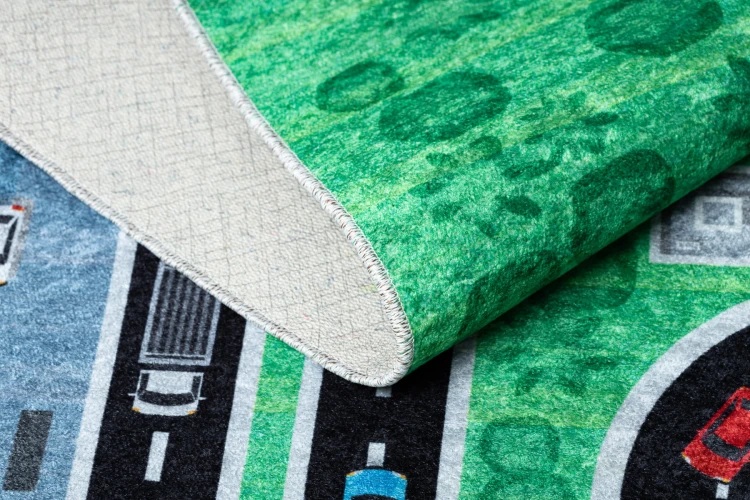 Zielony dywan z motywem miasta, który ożywi pokój dziecka i stworzy przestrzeń do zabawy.
