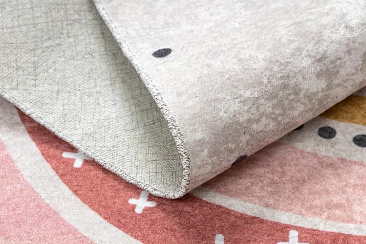 Beżowy dywan z motywem tęczy, który subtelnie ożywi pokój dziecka i stworzy ciepłą przestrzeń do zabawy.