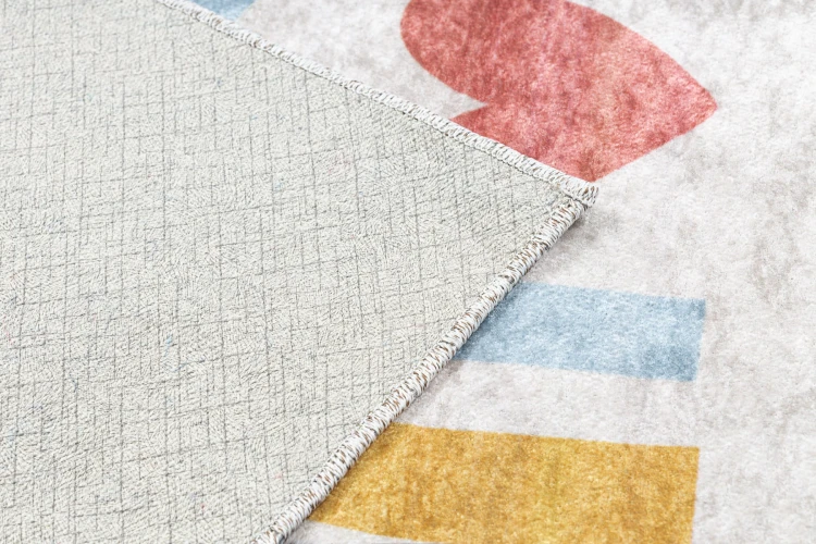 Beżowy dywan z motywem tęczy, który subtelnie ożywi pokój dziecka i stworzy ciepłą przestrzeń do zabawy.