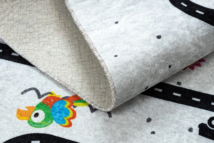 Szary dywan z motywem zwierząt, który subtelnie ożywi pokój dziecka i stworzy przestrzeń do zabawy.