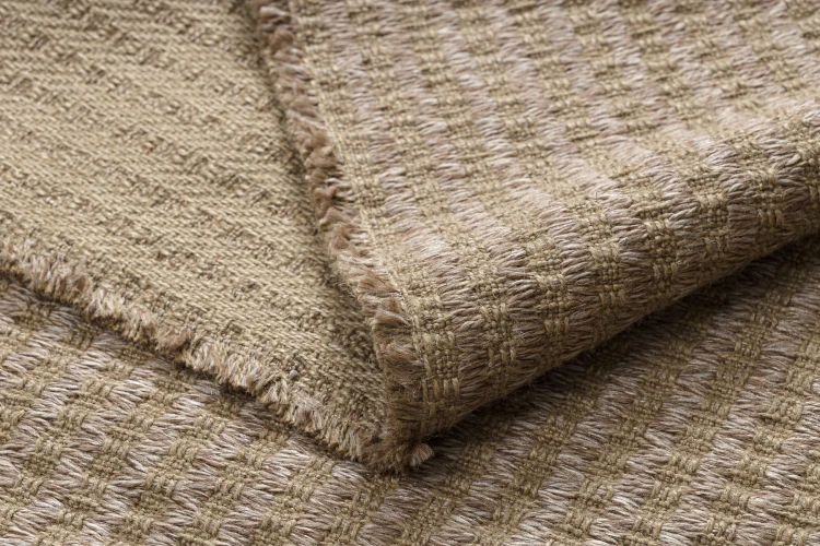 Beżowy dywan z delikatnym wzorem w paski, który idealnie wypełni korytarz, nadając mu ciepły i uporządkowany charakter.