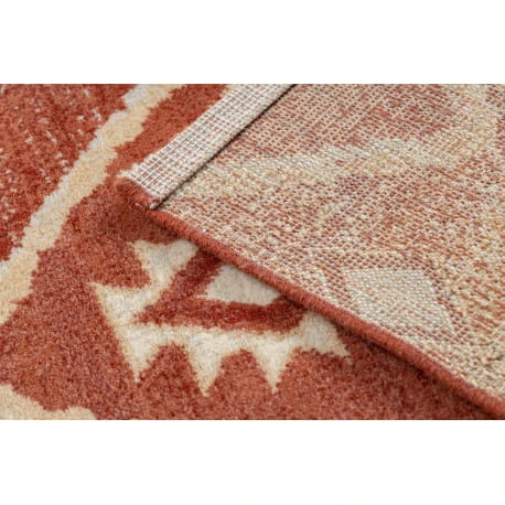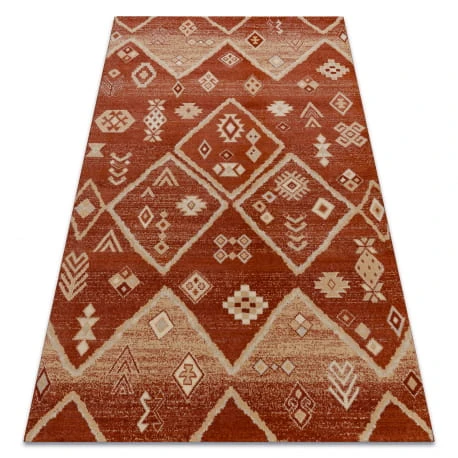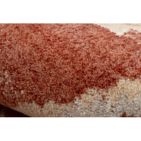 Beżowo-czerwony dywan wełniany z abstrakcyjnym wzorem, który doda salonowi wyrazisty charakter i ciepłą atmosferę.