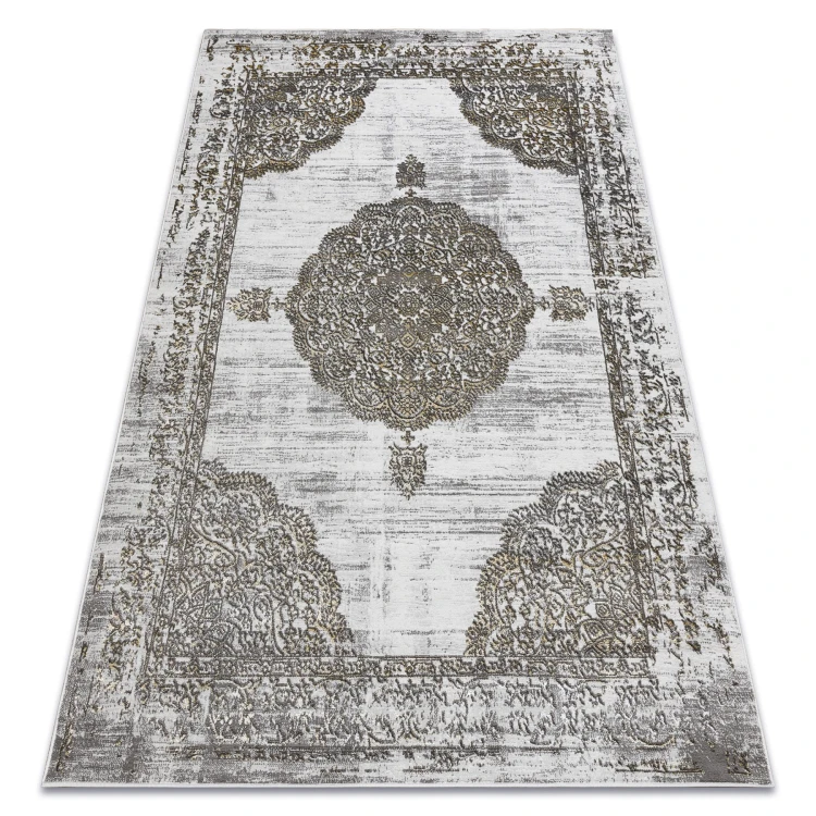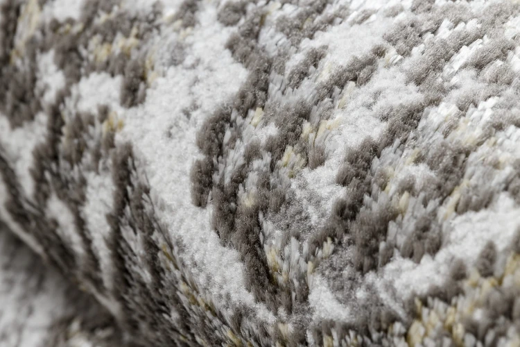 Szaro-złoty dywan z abstrakcyjnym wzorem, który doda wnętrzu elegancki charakter i ciepły blask.