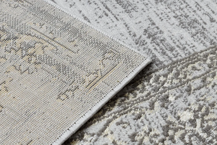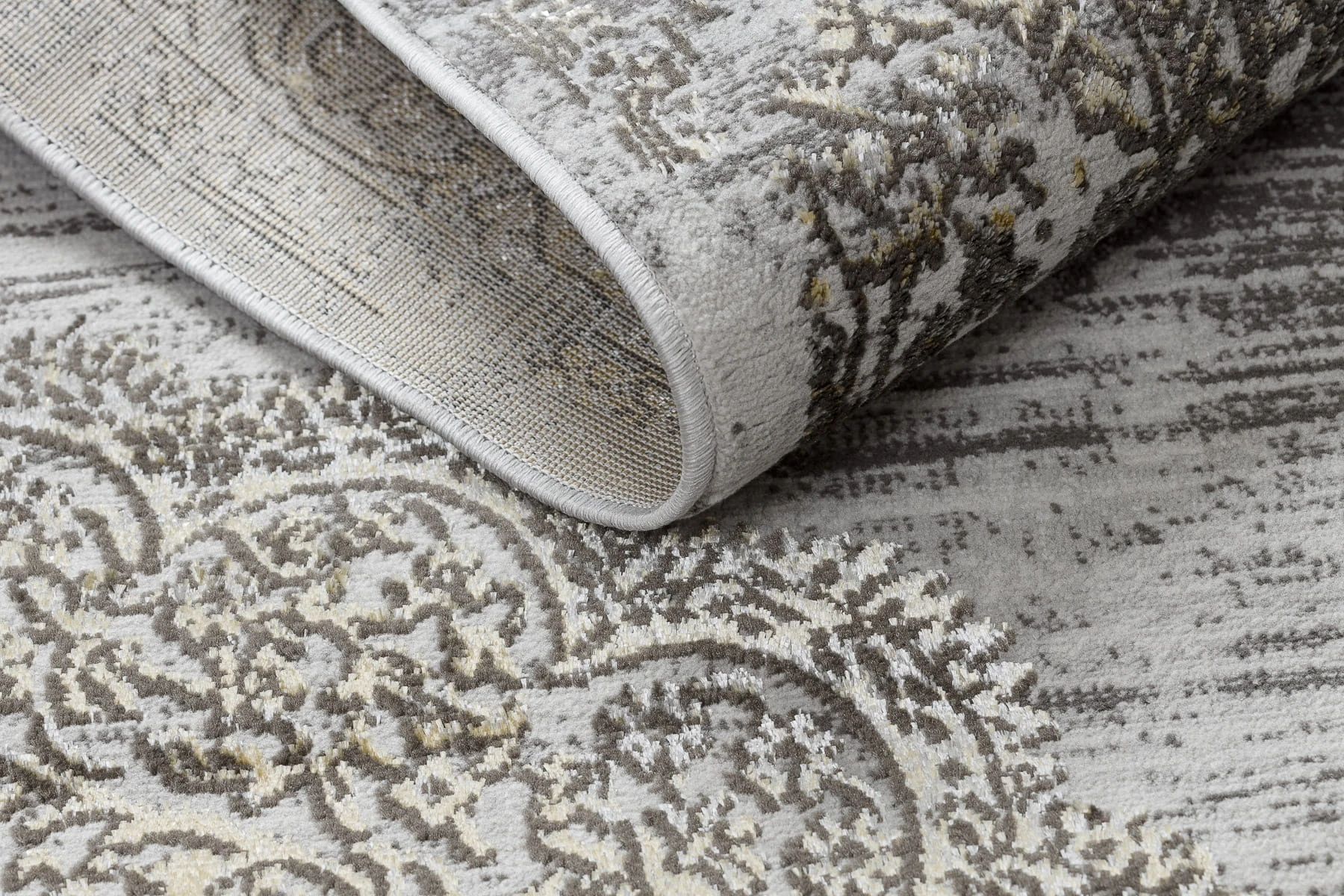 Szaro-złoty dywan z abstrakcyjnym wzorem, który wprowadzi elegancję do korytarza i nada mu reprezentacyjny charakter.