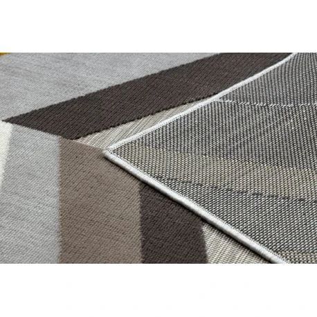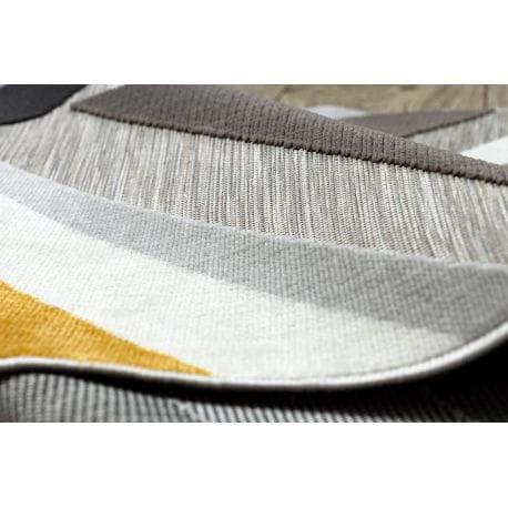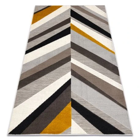 Szary dywan z geometrycznym wzorem jodełki i żółtymi akcentami, który nadaje korytarzowi nowoczesny charakter.