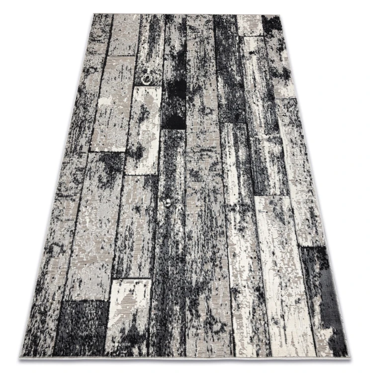 Szary dywan z abstrakcyjnym wzorem płytek, który doskonale sprawdzi się w salonie lub pokoju, nadając wnętrzu nowoczesny charakter.