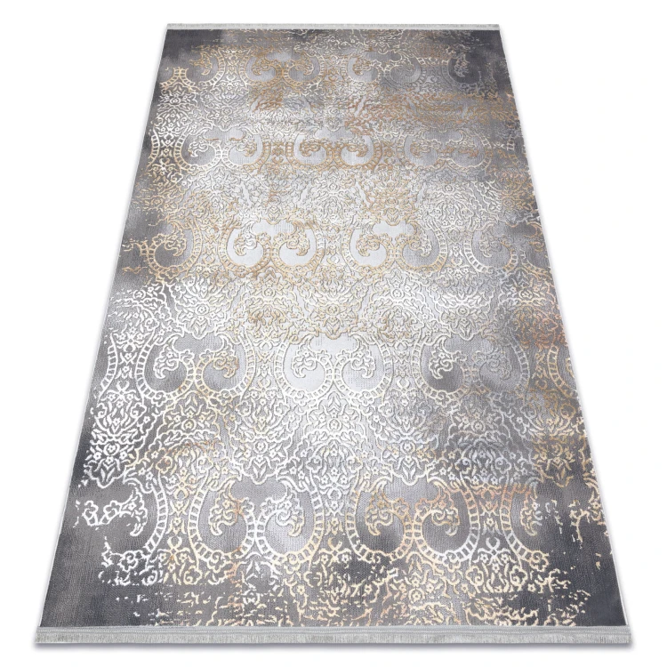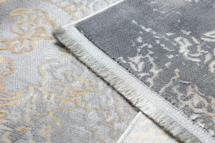 Szaro-musztardowy dywan z abstrakcyjnym wzorem, który ożywi salon ciepłym, żółtym akcentem.