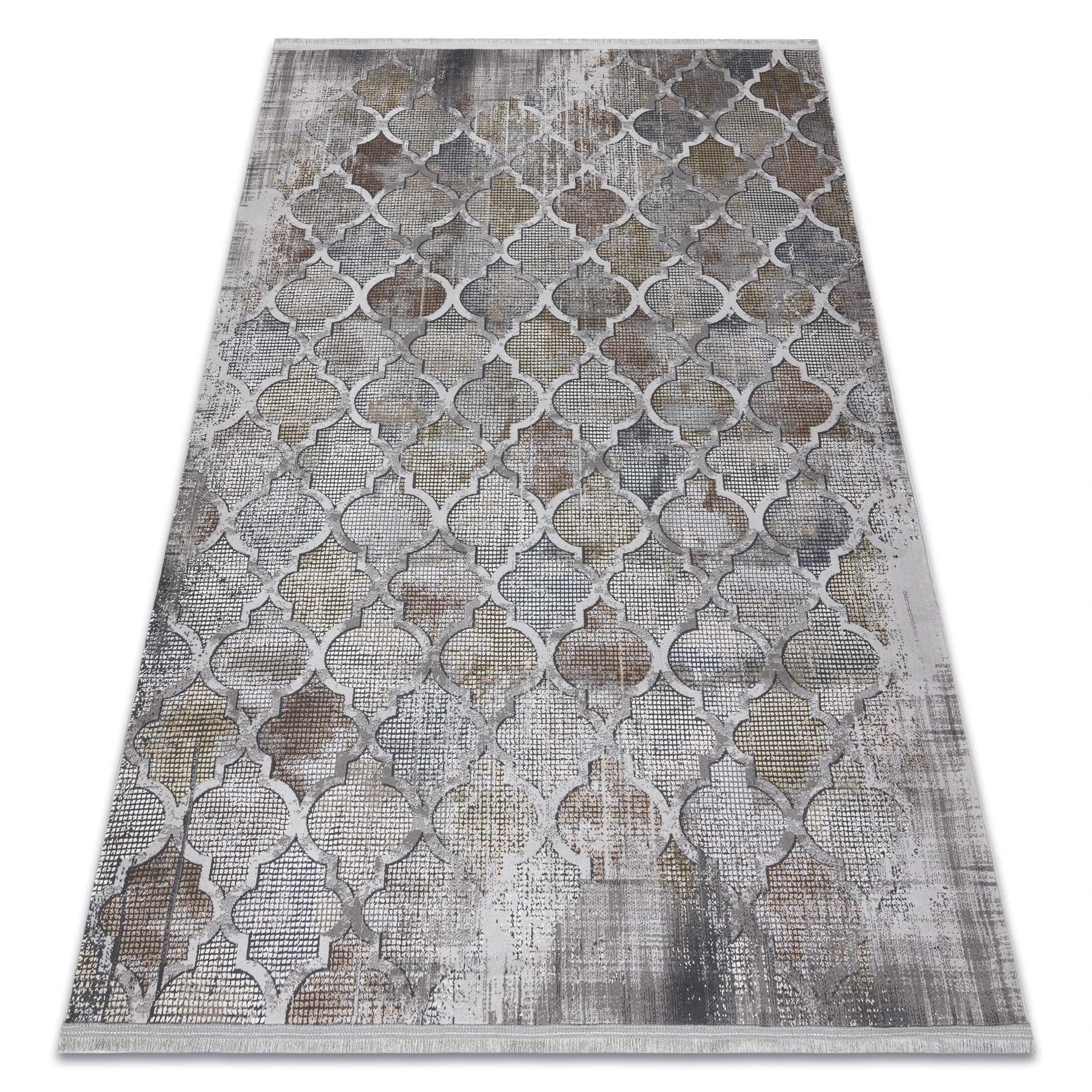 Szaro-musztardowy dywan z geometrycznym wzorem, który doskonale ożywi salon ciepłym, kolorowym akcentem.