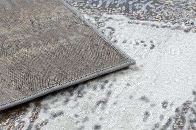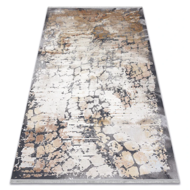 Szaro-musztardowy dywan z abstrakcyjnym wzorem kostki brukowej, który ożywi salon nowoczesnym charakterem.