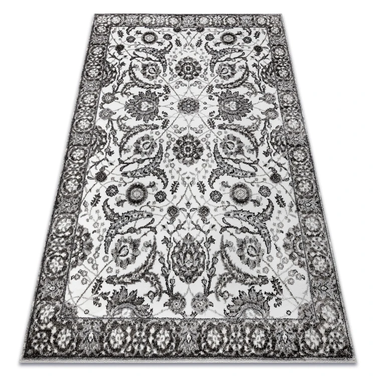Szary dywan z klasyczną ramką, który nadaje salonowi elegancki charakter w ponadczasowym stylu.