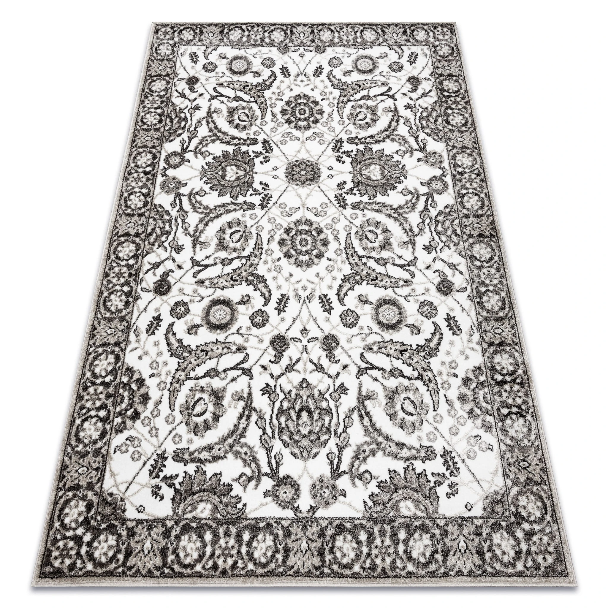 Szary dywan z elegancką ramką, który doskonale sprawdzi się w salonie, dodając wnętrzu klasycznego charakteru.