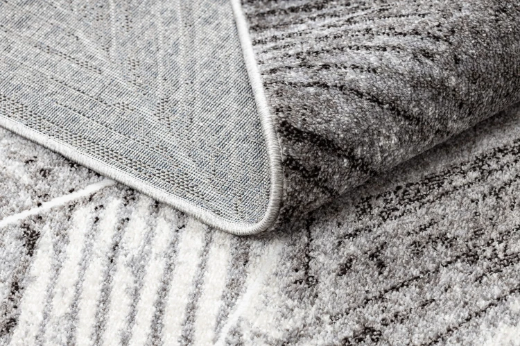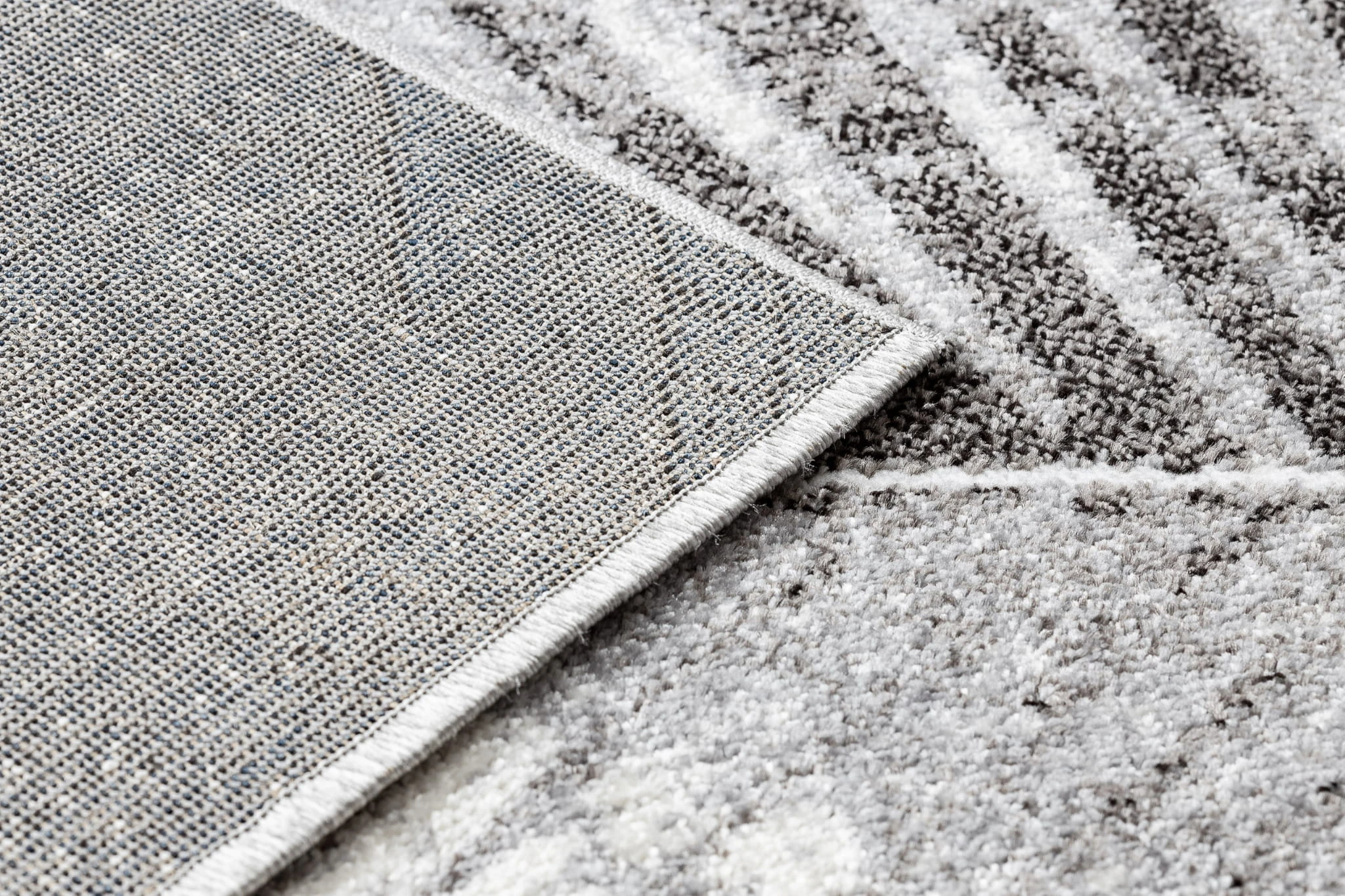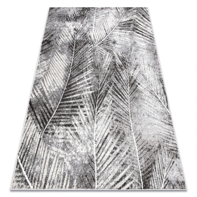 Szary dywan z motywem liści palmy, który wprowadzi do salonu naturalny, botaniczny charakter.