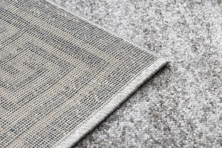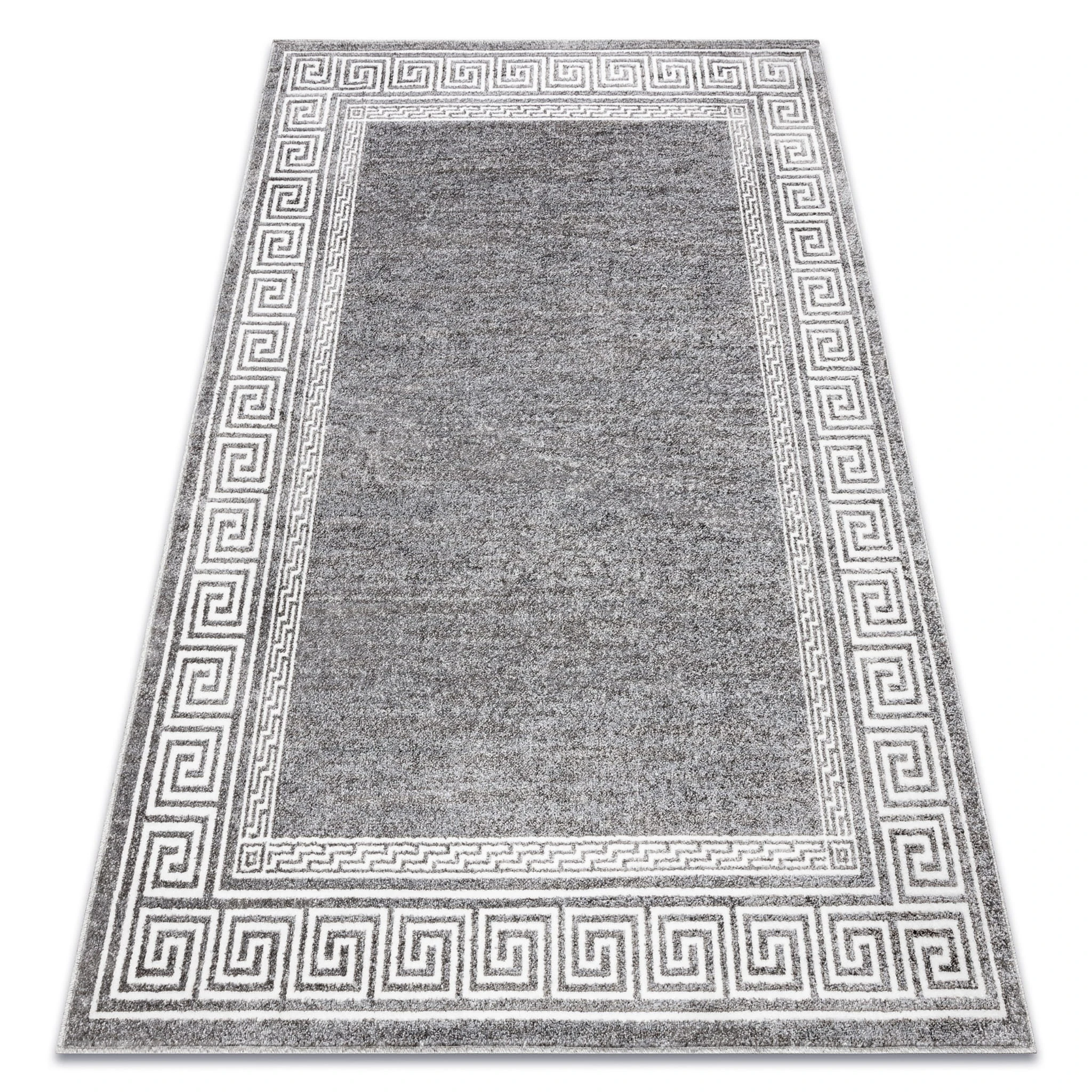 Szary dywan z delikatnym wzorem ramki, który doskonale sprawdzi się w salonie, dodając wnętrzu eleganckiej struktury.