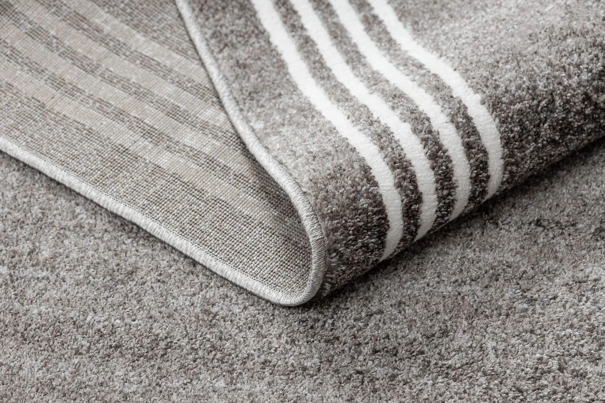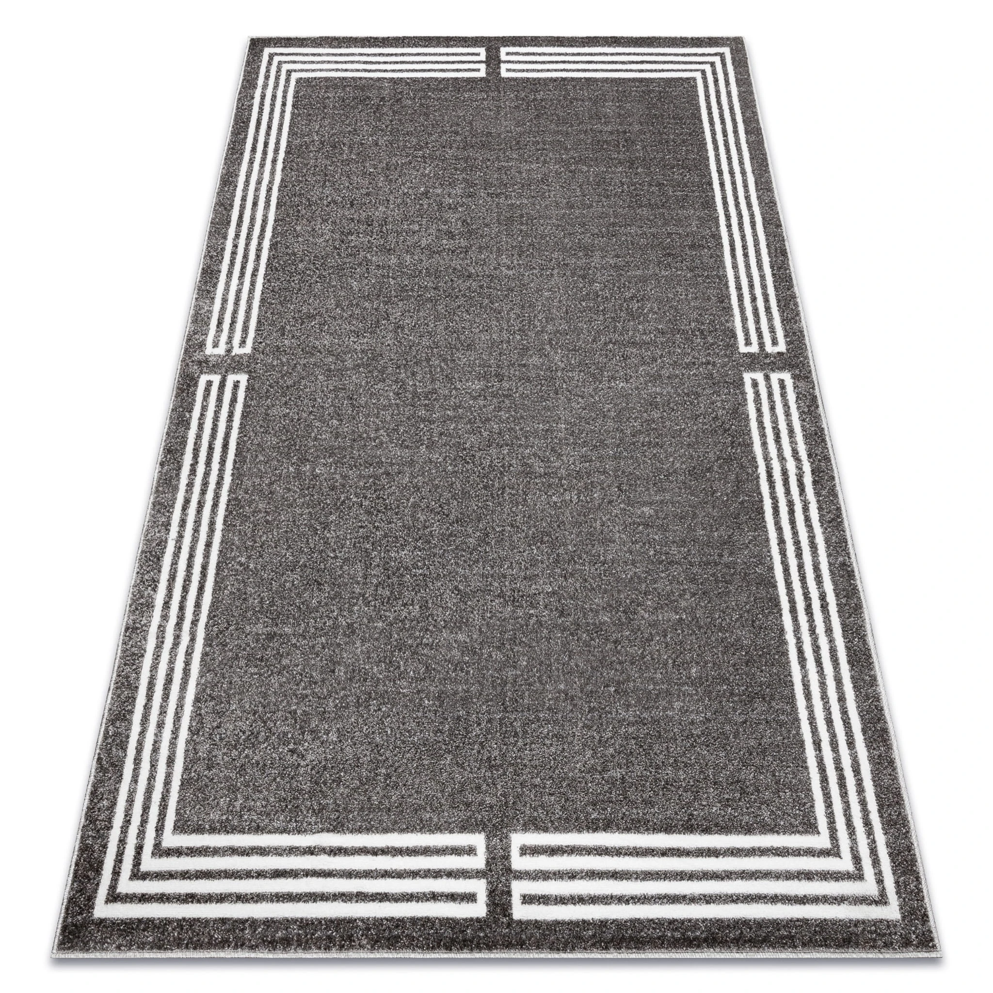 Szary dywan z dekoracyjną ramką, który elegancko podkreśli przestrzeń salonu lub pokoju.