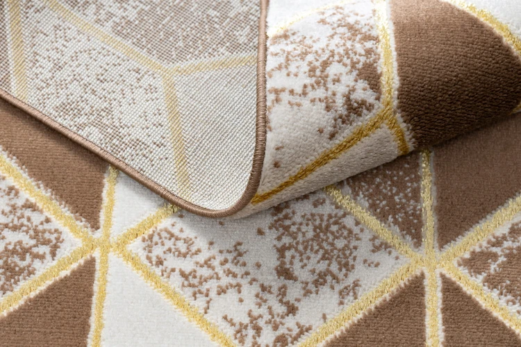 Beżowy dywan z geometrycznym wzorem kostki, który doda salonowi nowoczesny charakter i stonowaną elegancję.