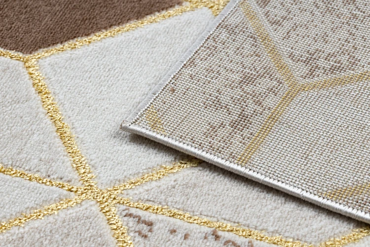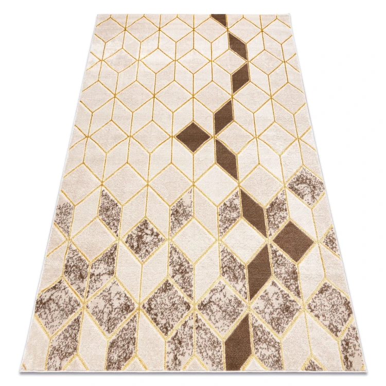 Kremowo-beżowy dywan z geometrycznym wzorem kostek, który doda salonowi nowoczesny charakter.