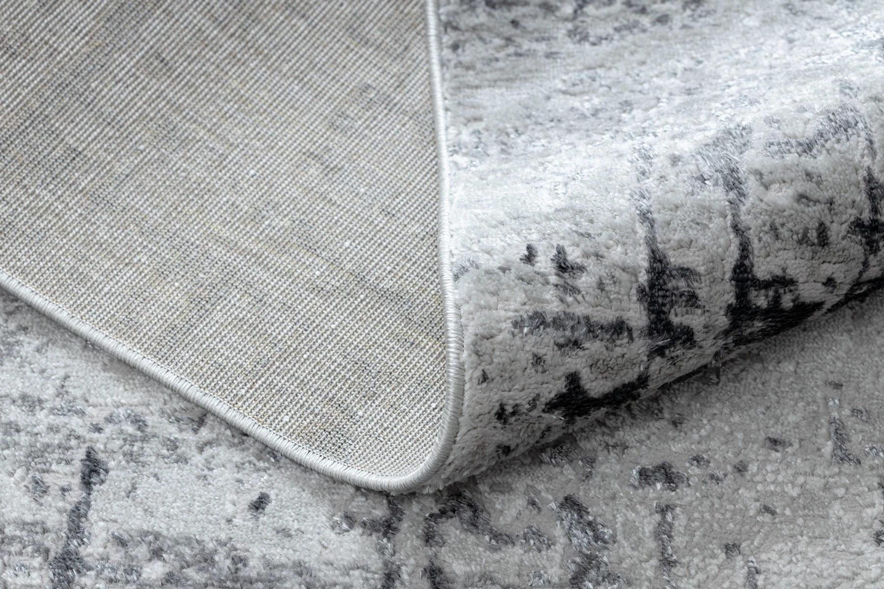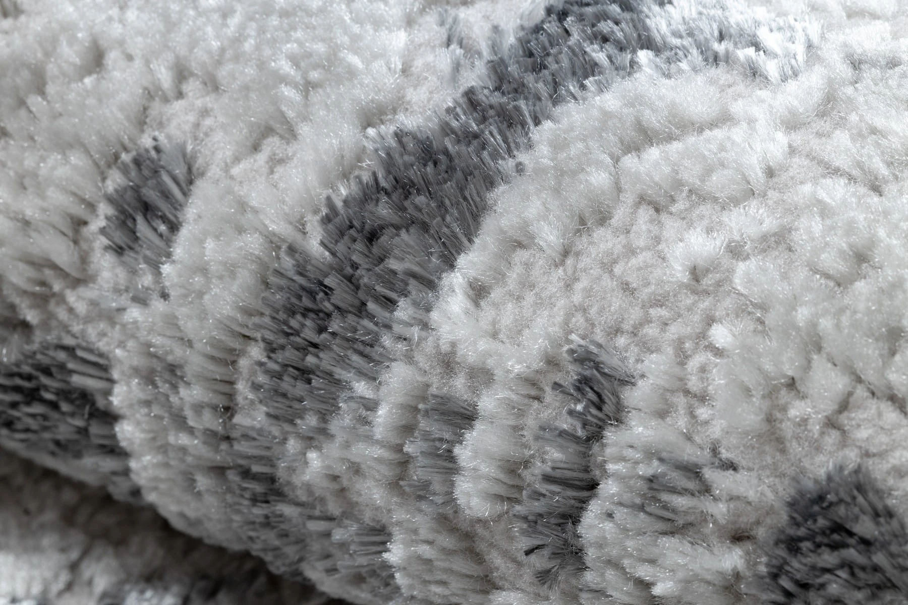 Prostokątny dywan w szaro-białe paski, który nadaje korytarzowi nowoczesny charakter i optycznie go wydłuża.