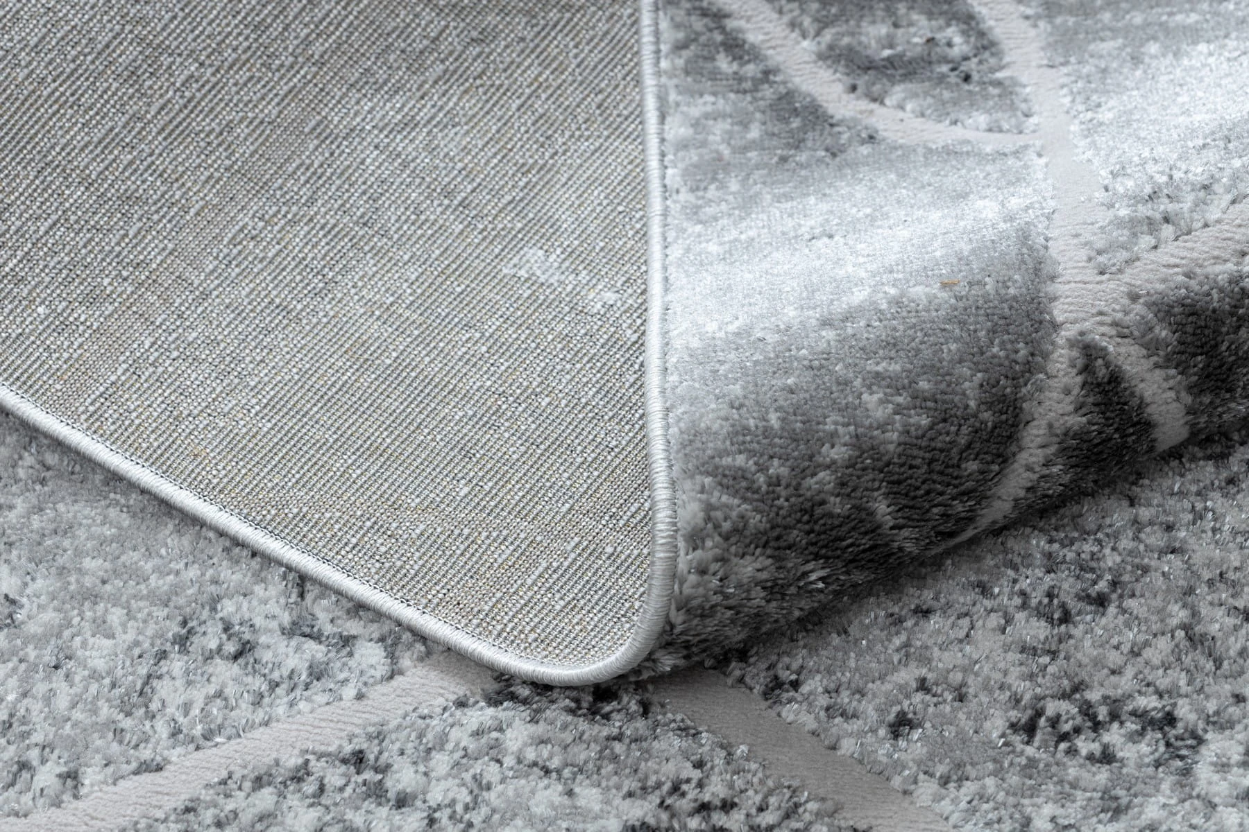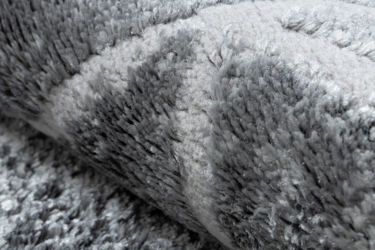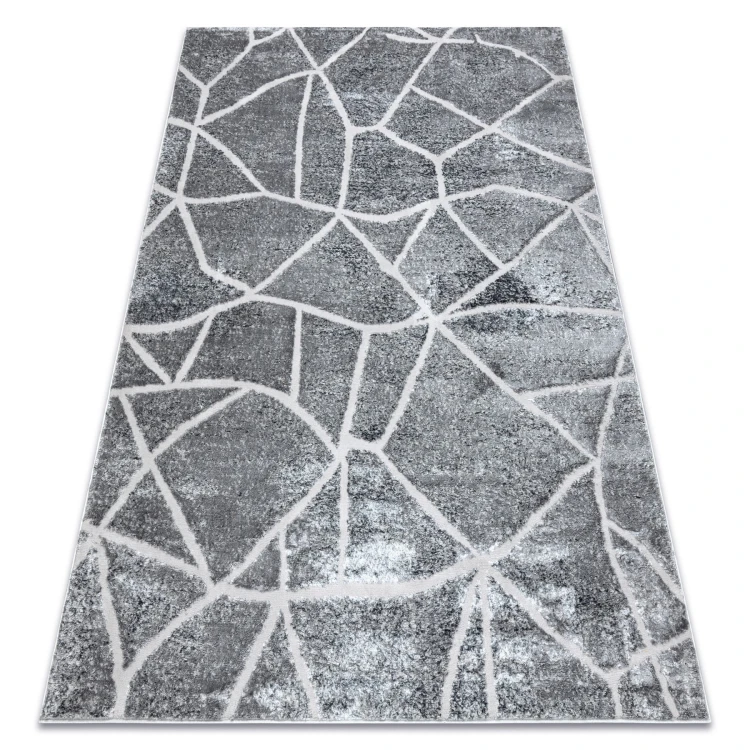 Szary dywan z abstrakcyjnym wzorem marmuru, który doda salonowi nowoczesny, elegancki charakter.