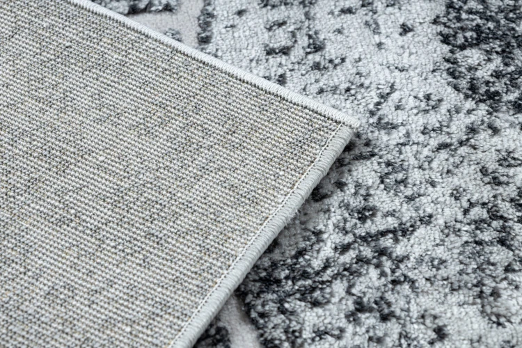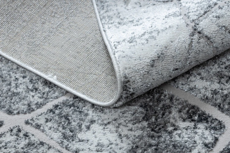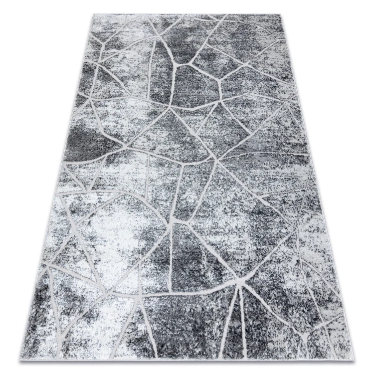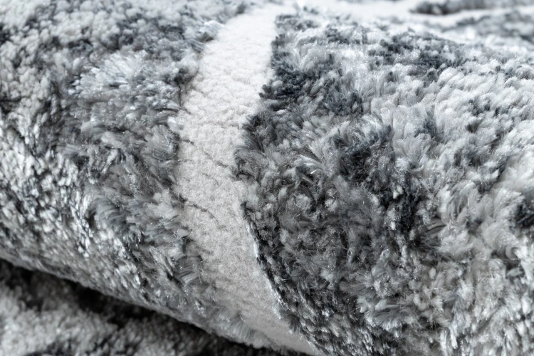 Szary dywan z abstrakcyjnym marmurkowym wzorem, który doskonale wpisze się w nowoczesne salony i pokoje.