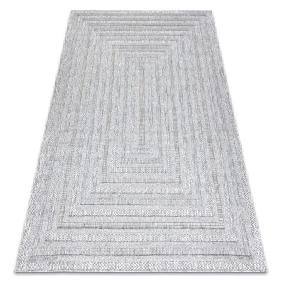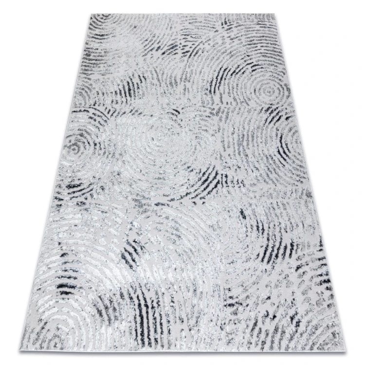 Szary dywan z geometrycznym wzorem kół, który doskonale sprawdzi się w salonie lub pokoju, dodając wnętrzu nowoczesny charakter.