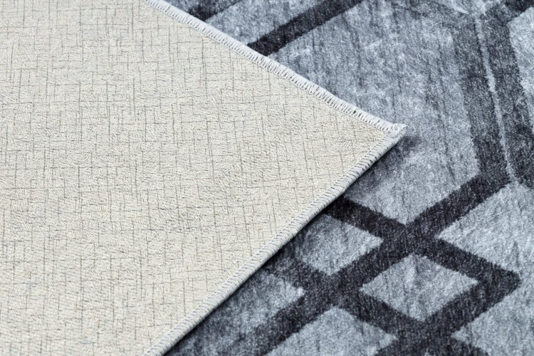 Szary dywan z geometrycznym wzorem, który doskonale sprawdzi się w salonie lub pokoju, dodając wnętrzu nowoczesny charakter.