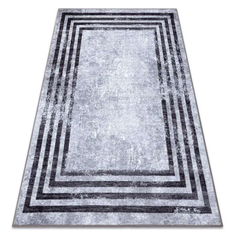 Szary dywan z geometrycznym wzorem, który doskonale sprawdzi się w salonie lub pokoju, dodając wnętrzu nowoczesny charakter.