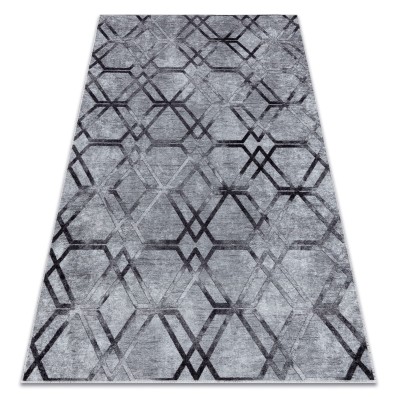 Szary dywan z geometrycznym wzorem, który doskonale sprawdzi się w salonie lub pokoju, dodając wnętrzu nowoczesny charakter.